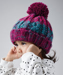 Cuffed design for optimal decoration. Heavyweight multi yarn cable knit design. Luxurious shearling thermal band for extra warmth. Bold four colour stripe design. Also available in adult sizes.